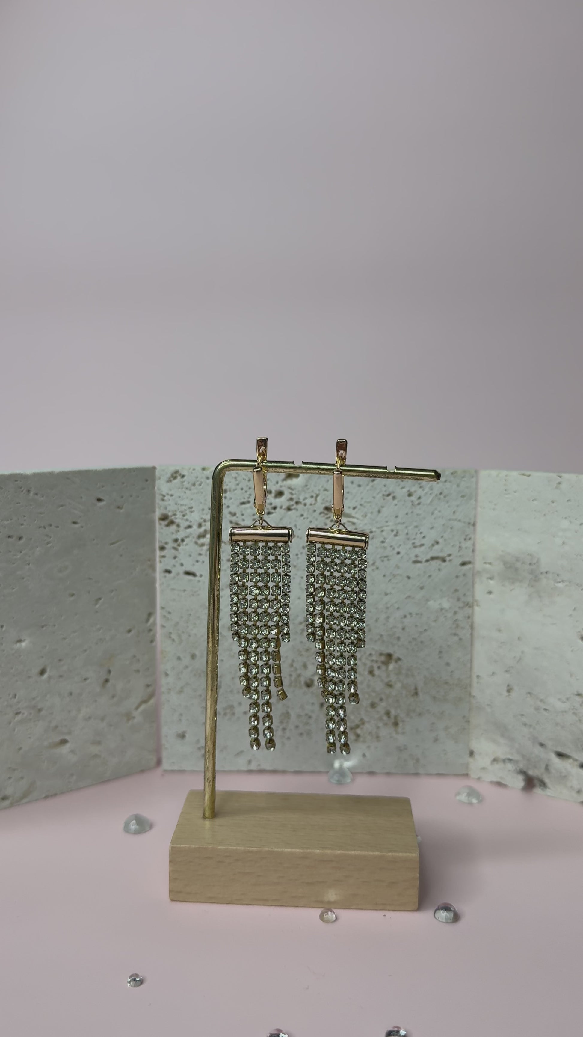 Korut koostuvat kevyesti liikkuvista strassiketjuista, jotka muodostavat valuvan muodon — lyhyemmistä ketjuista reunoilla, pisimpiin keskellä.