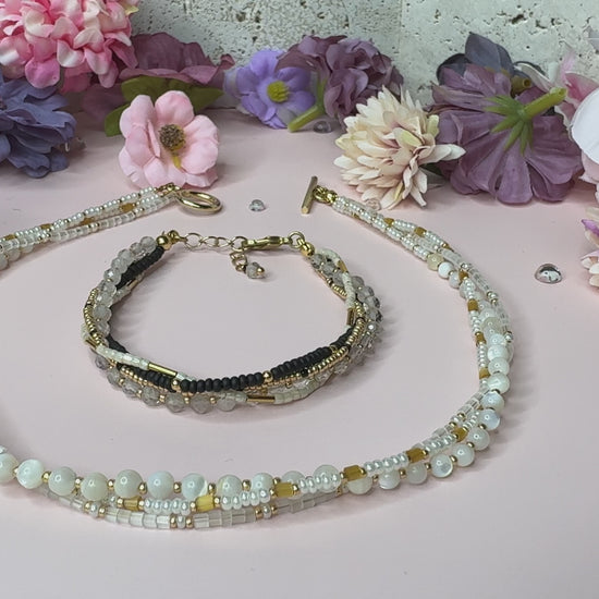 Tämä herkkä ja elegantti chokeri yhdistää hohtavan valkoisen satiinirouheen, helmimäistä ja kultaista siemenhelmeä sekä 4 mm:n kokoisia luonnollisia helmiäishelmiä.