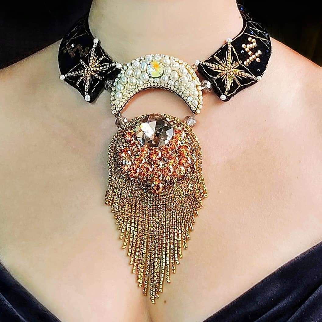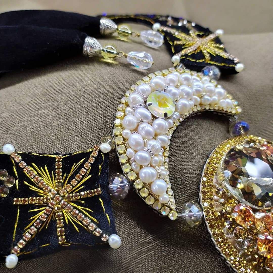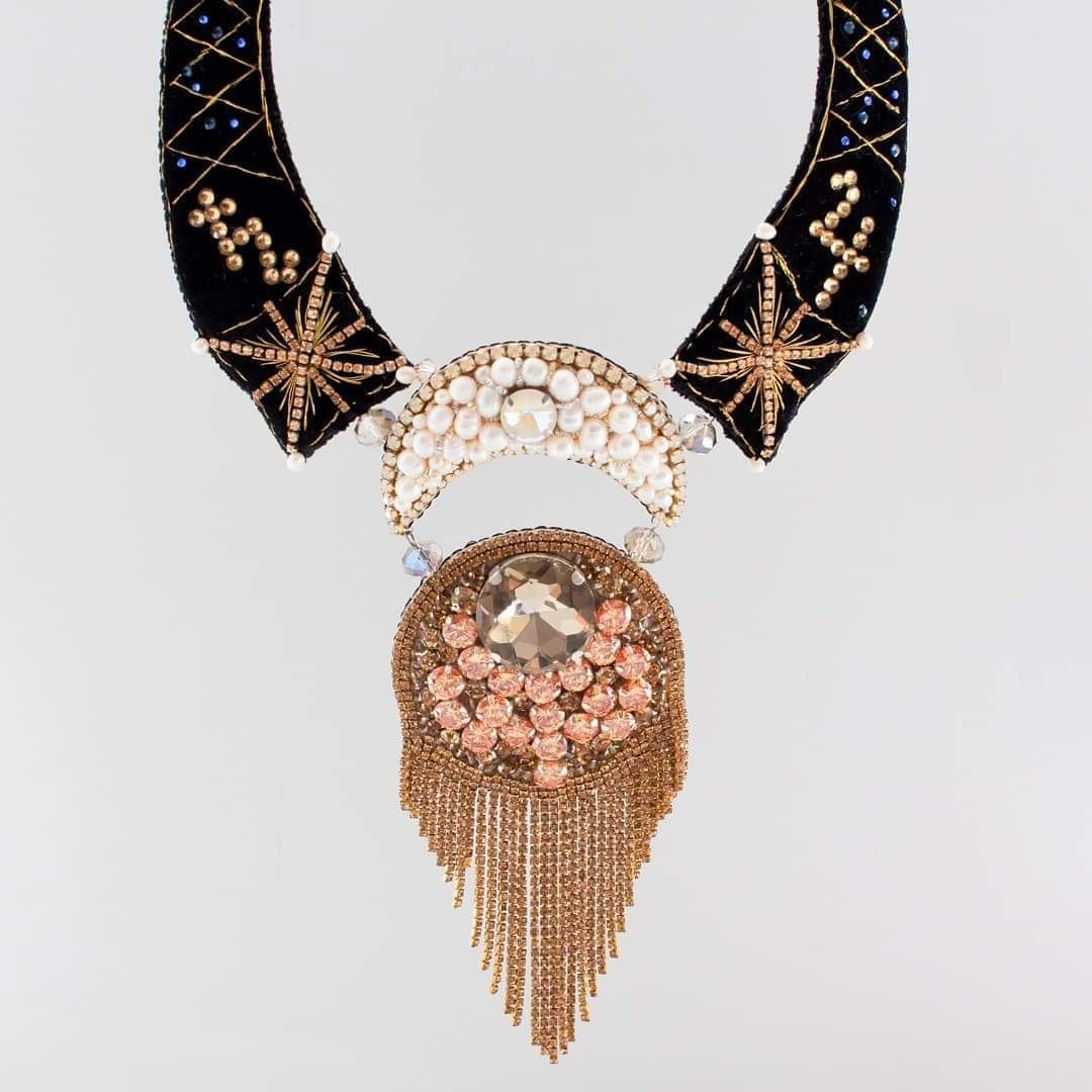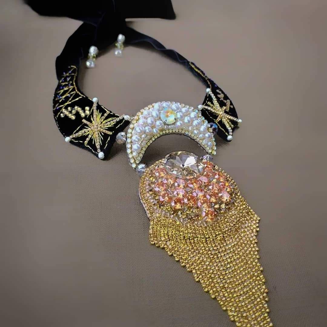 Tämä käsin kirjailtu kaulakoru on syntynyt hiljaisesta dialogista tähtien kanssa.