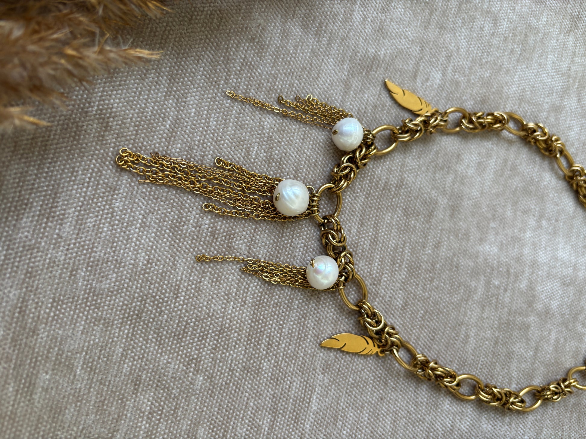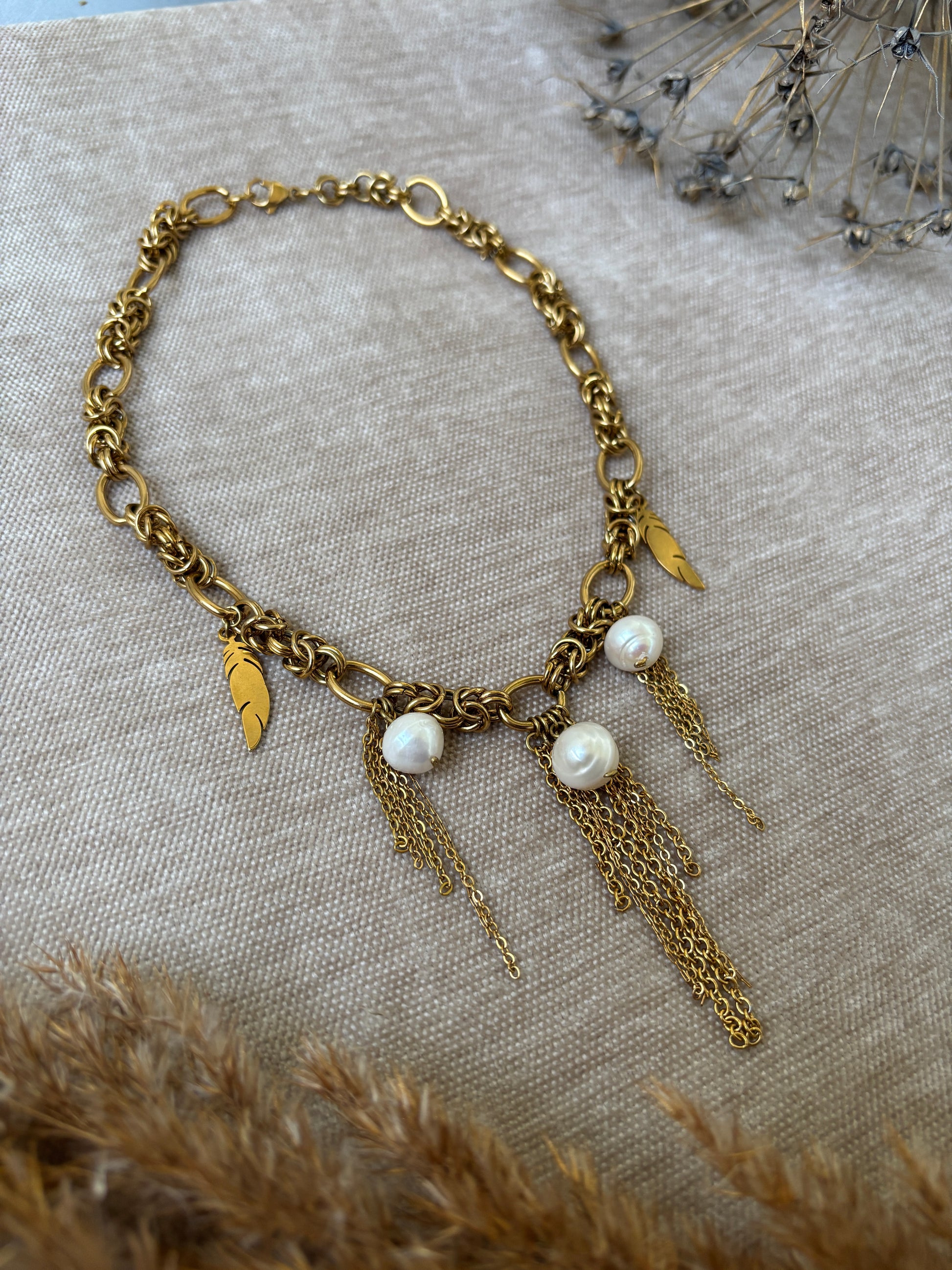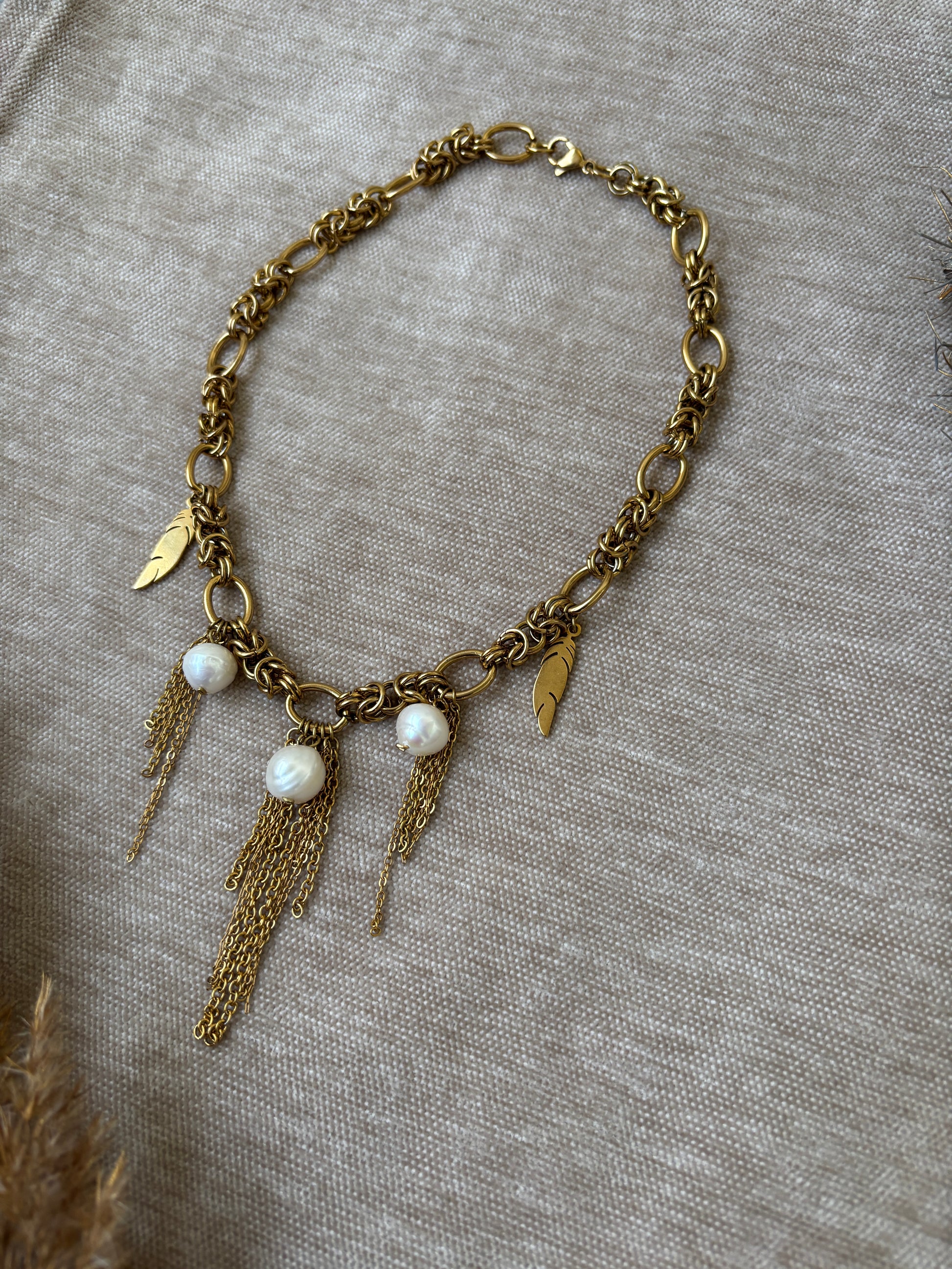 Kultasävyinen ketju helmiriipuksilla — voimaa ja pehmeyttä samassa korussa