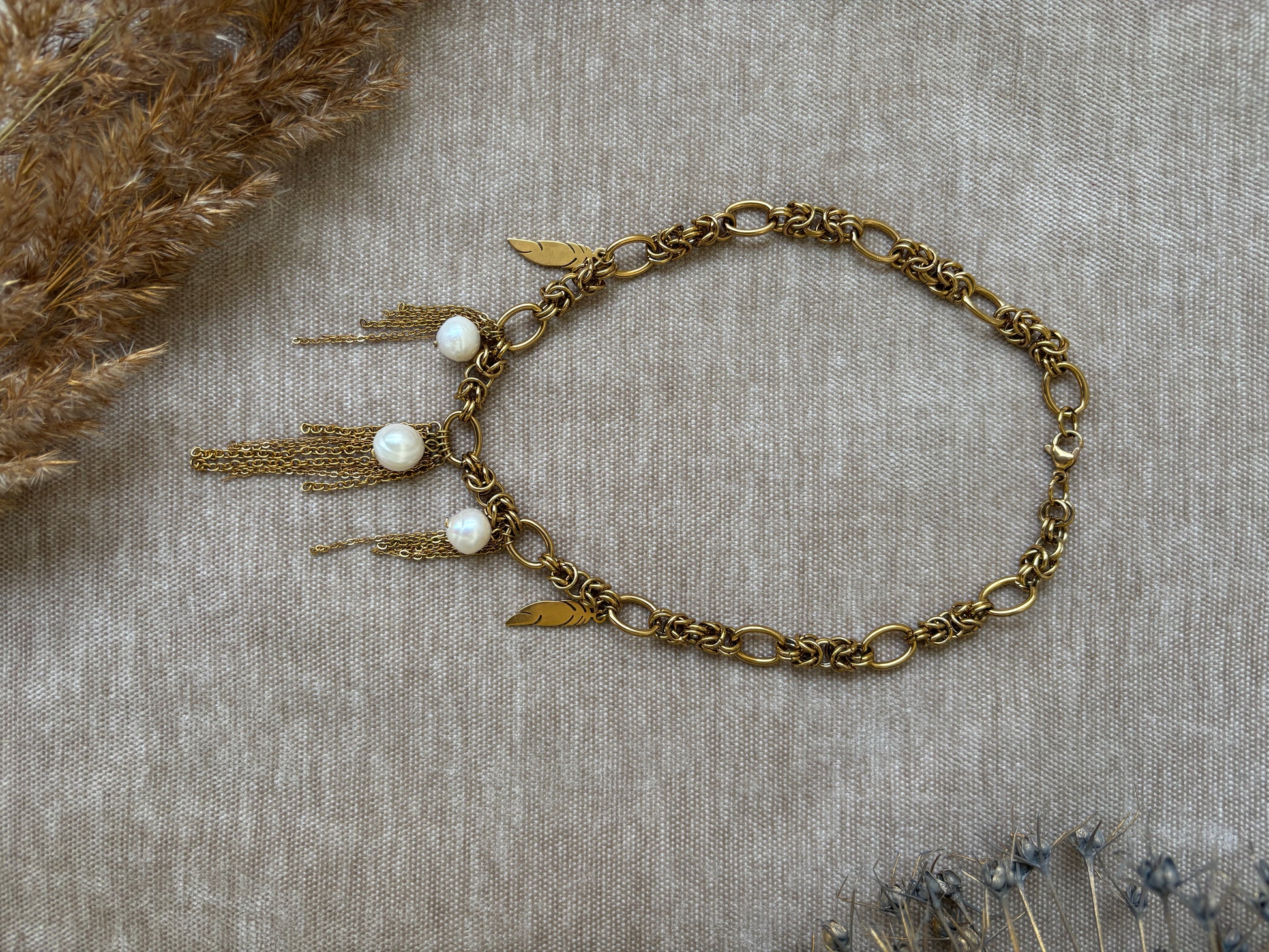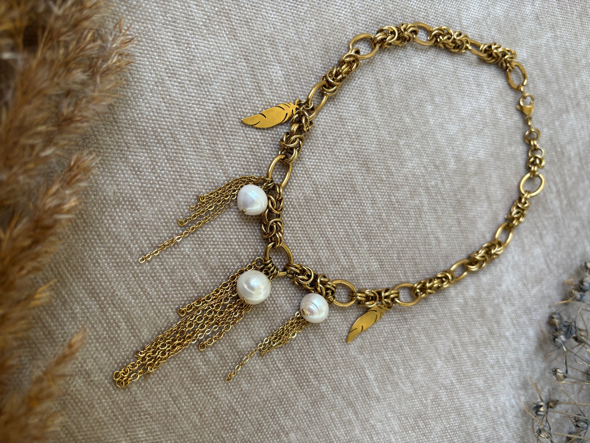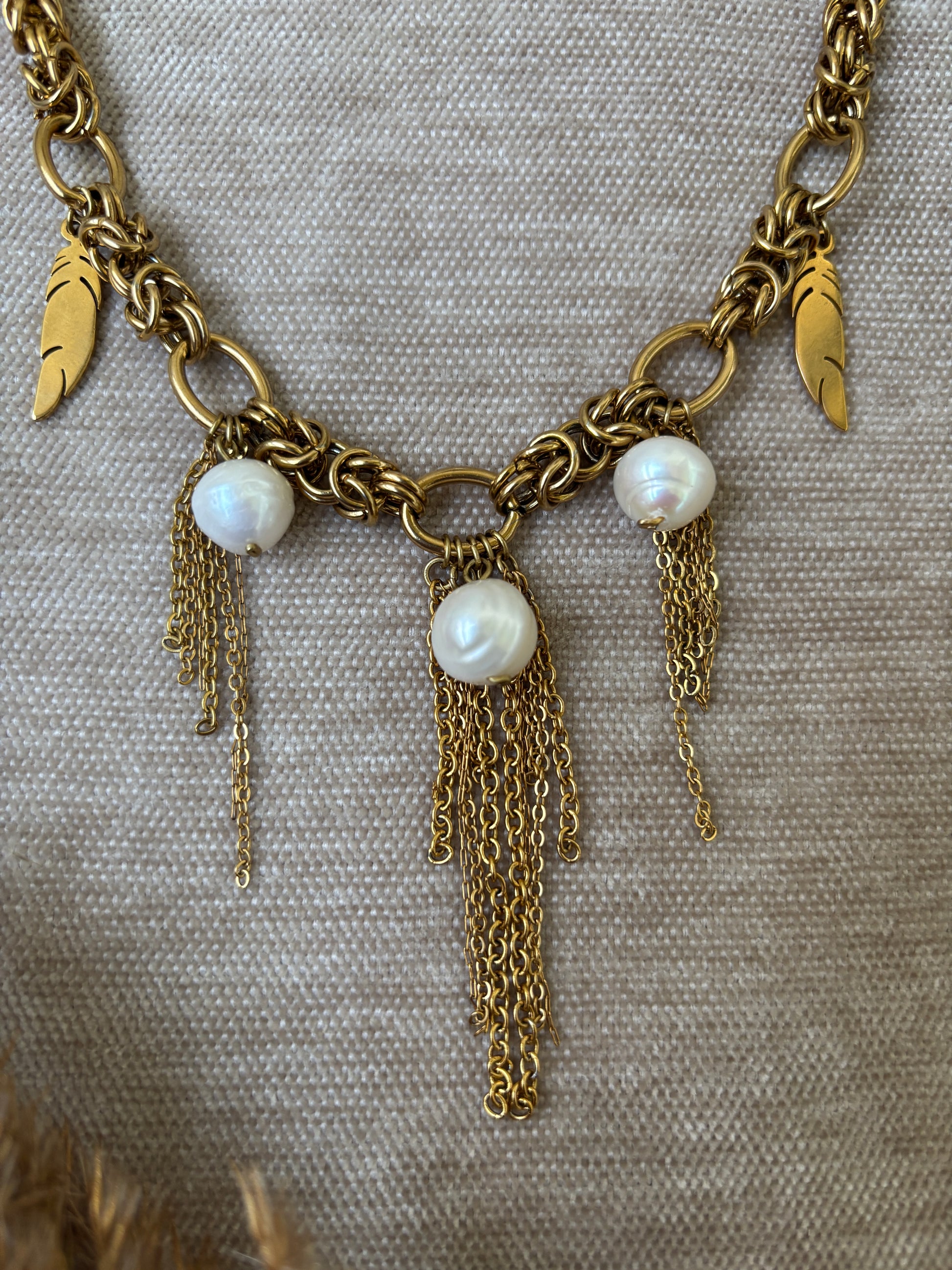 Kultasävyinen ketju helmiriipuksilla — voimaa ja pehmeyttä samassa korussa