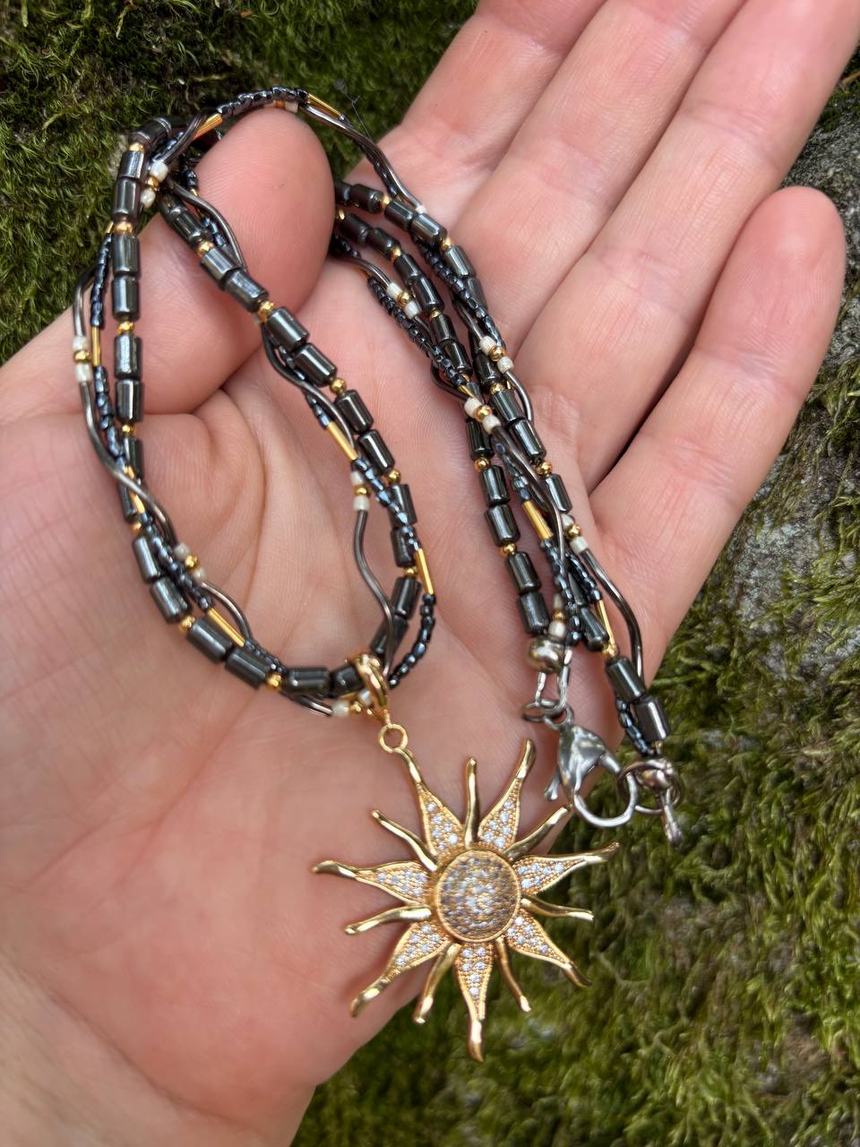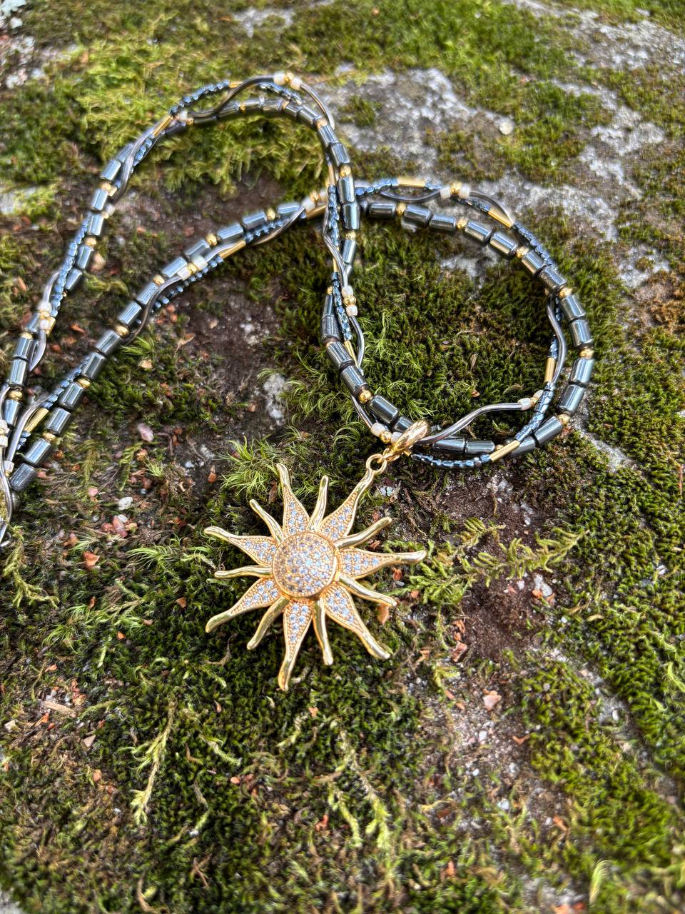 Elegantti monikerroksinen choker, jossa yhdistyvät luonnollinen hematiitti, kullatut lasihelmet sekä irrotettava auringonmuotoinen riipus, jota koristavat säihkyvät zirkonit. Riipus on päällystetty 18 karaatin kullalla.