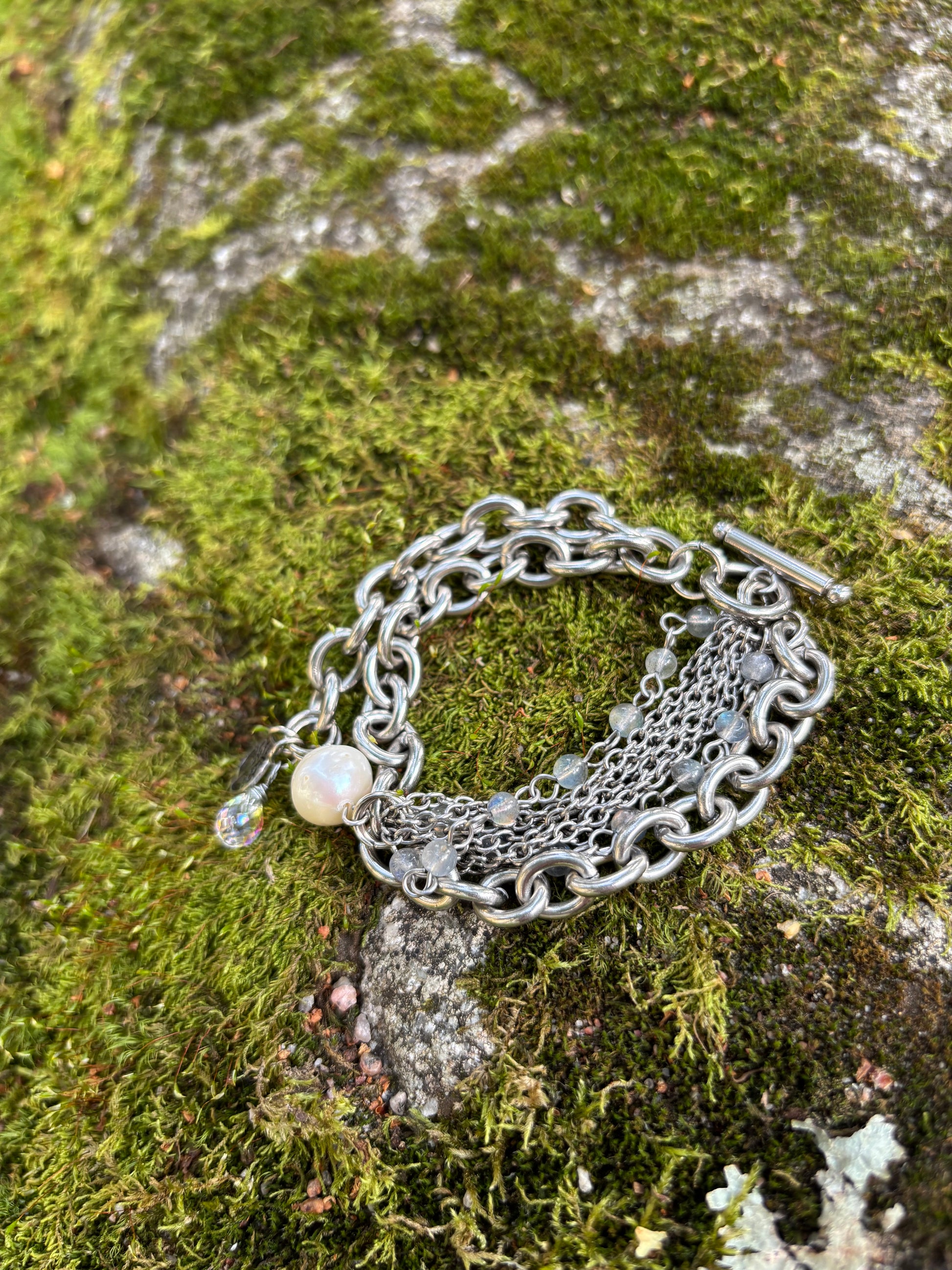 Tämä koru yhdistää teräksen voiman, helmien lempeyden ja luonnon mystiikan – muistutus siitä, että jokaisessa naisessa elää sekä voima että valo.