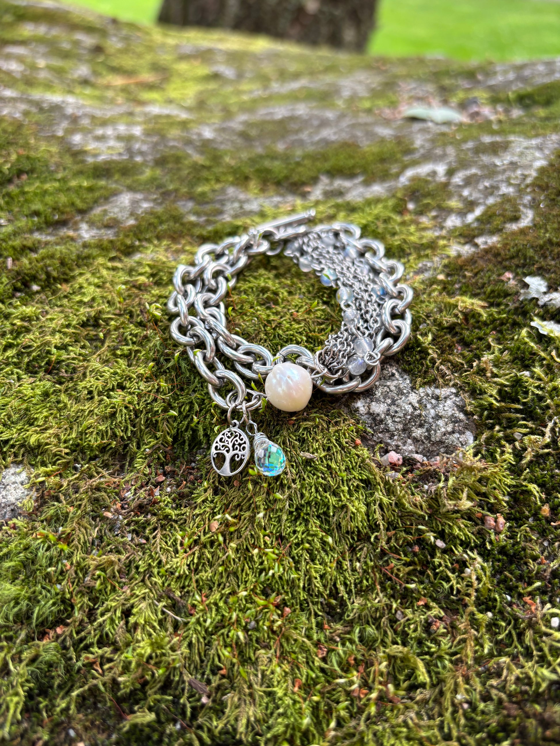 Keskelle korua asettuu suuri valkoinen helmi (11 mm) – kuin kuunsäde tyynen järven pinnalla, säteilemässä puhtautta ja naisellista eleganssia. Sen rinnalla keinuvat kaksi riipusta: sateenkaaren väreissä hohtava kristalli ja teräksinen elämänpuu, joka symboloi juuria, voimaa ja uudistumista.