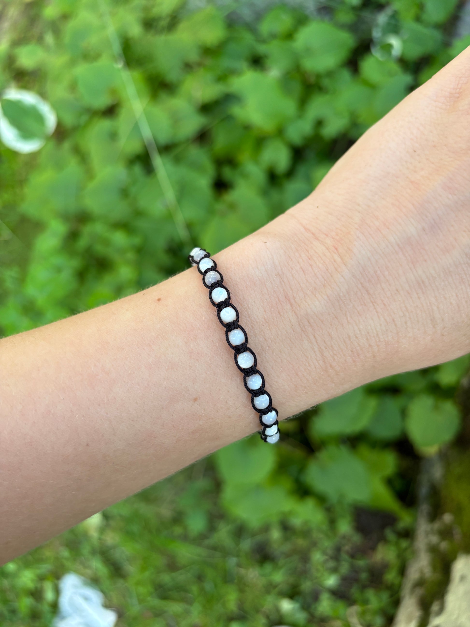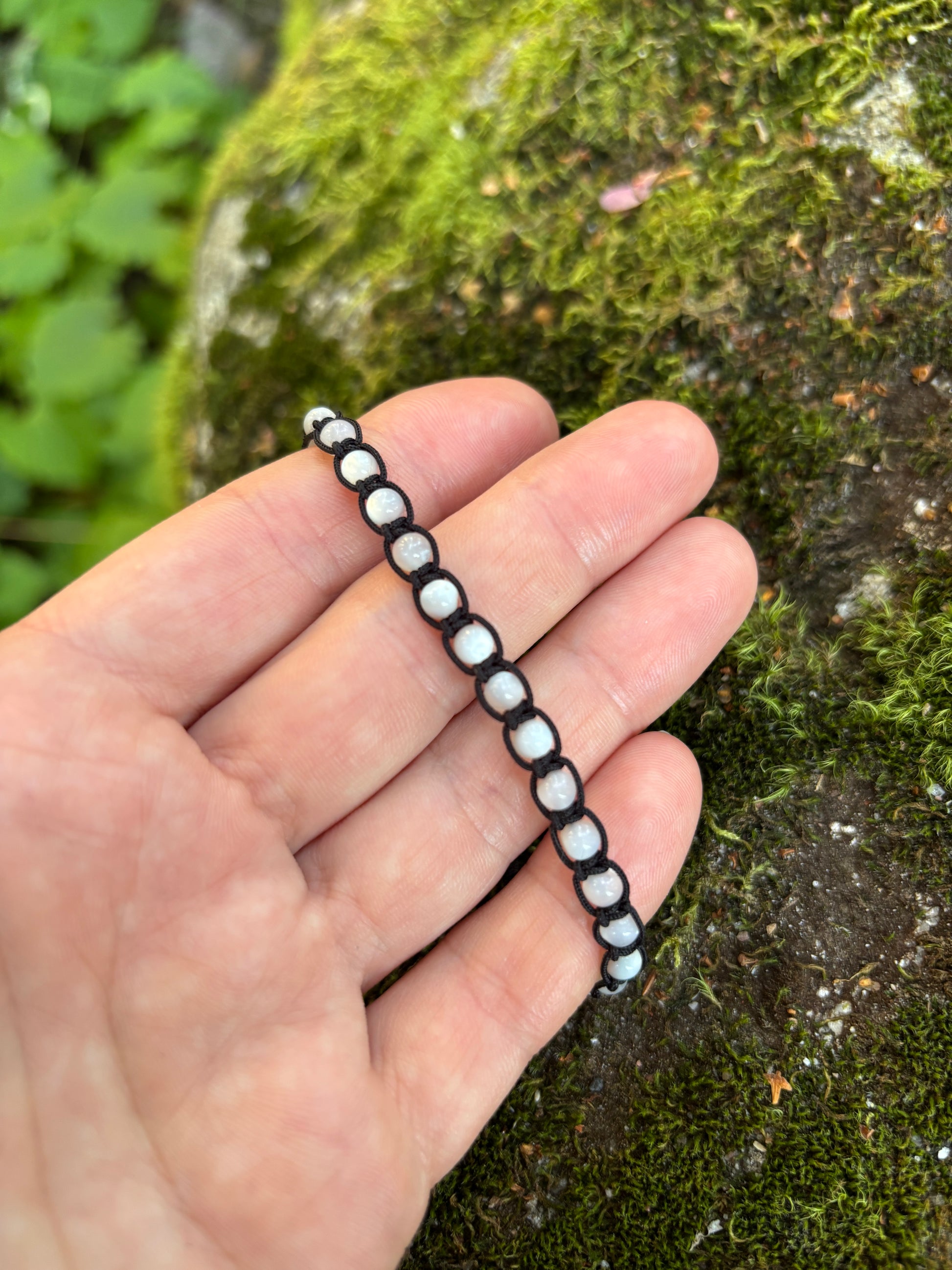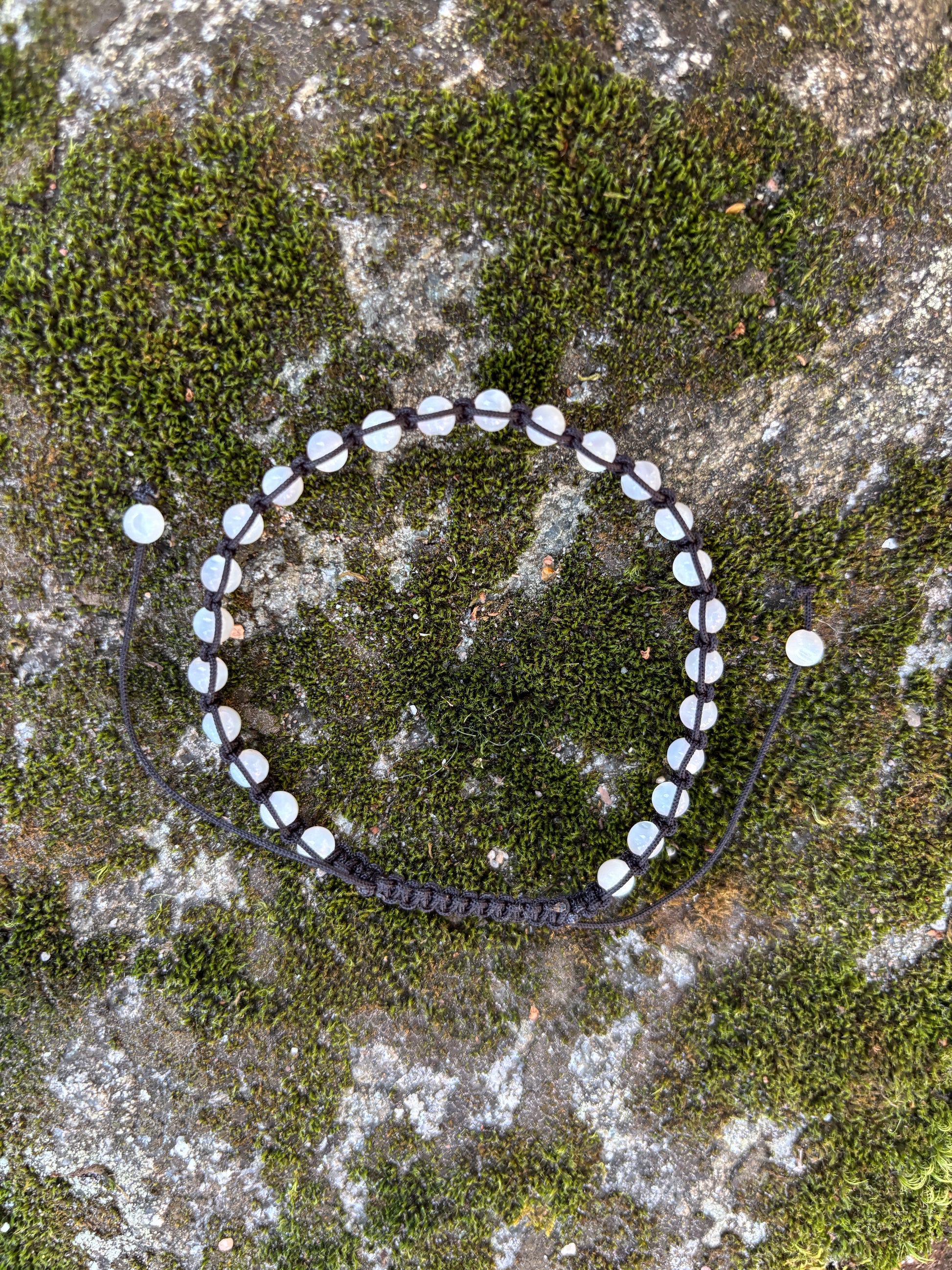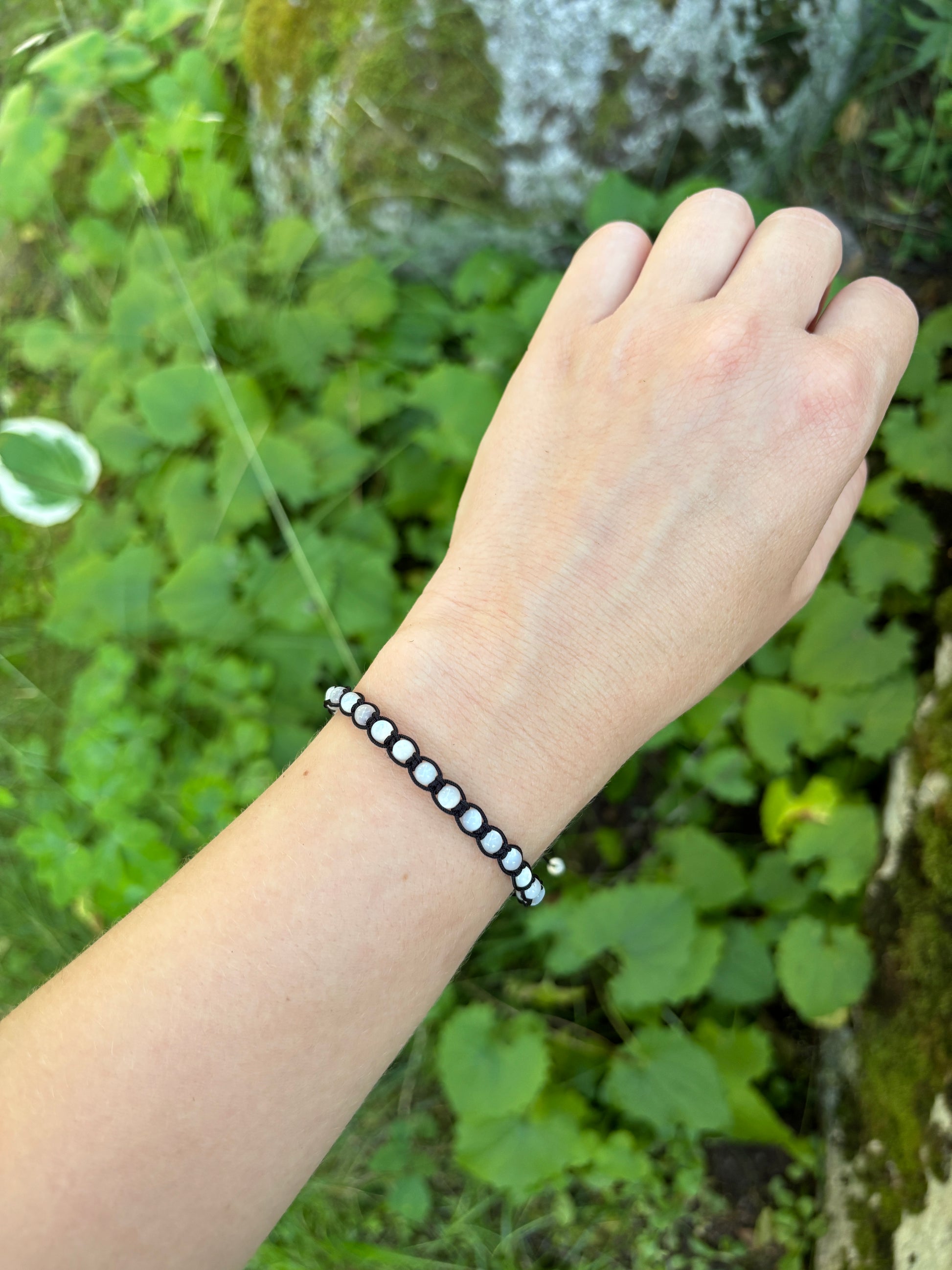 Tämä herkkä ja harmoninen shambhala-rannekoru on punottu mustalle nyörille, jonka keskelle on solmittu aidot valkoiset helmiäiset (4 mm).