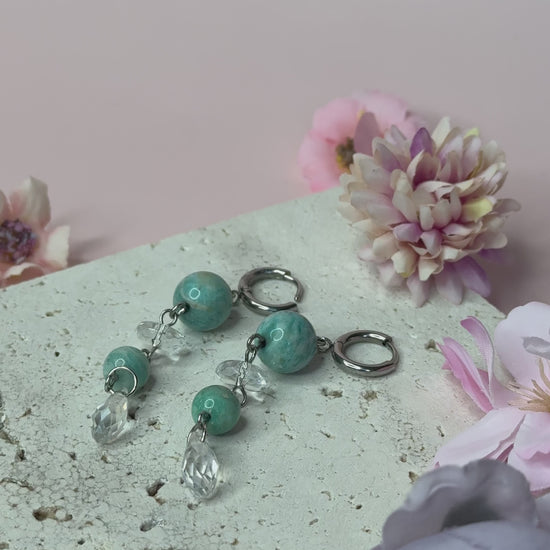 Pitkät, näyttävät korvakorut, joissa yhdistyvät luonnollinen amazoniiitti ja säihkyvä kristalli.