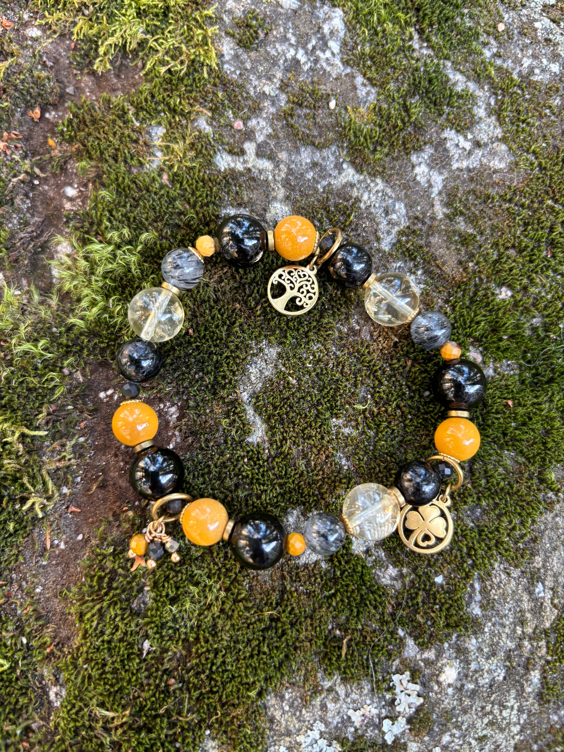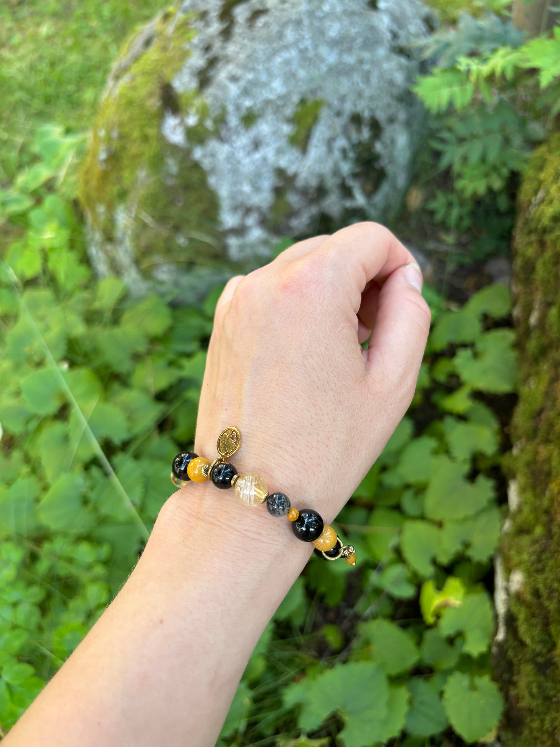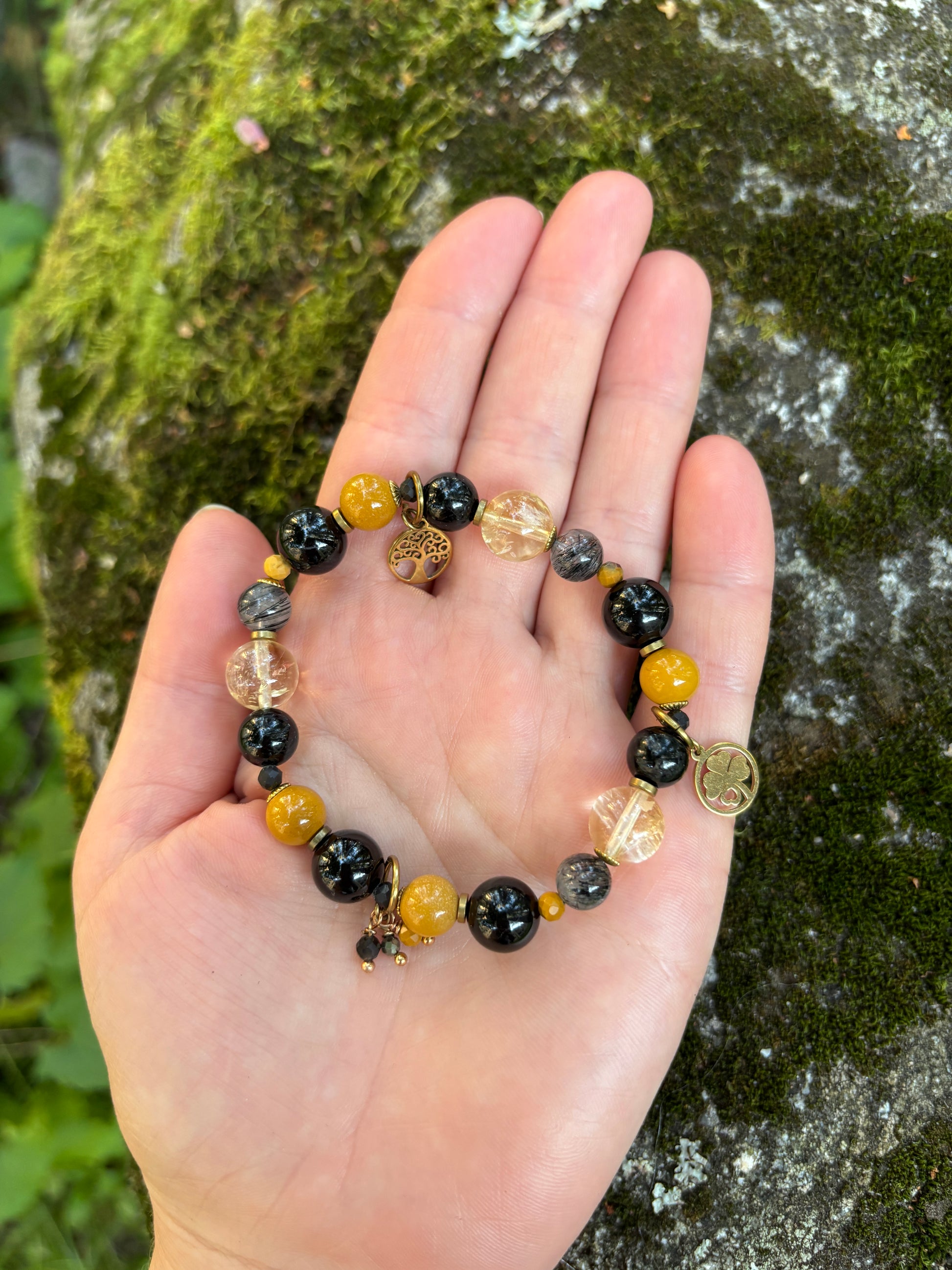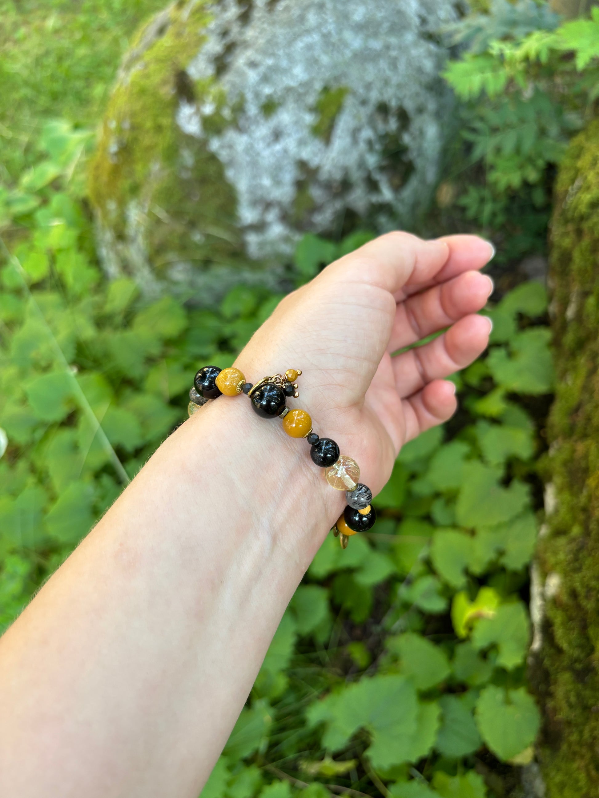 Suoja & Vetovoima — Musta-keltainen rannekoru turmaliinista, sitriinistä ja mukaiitista