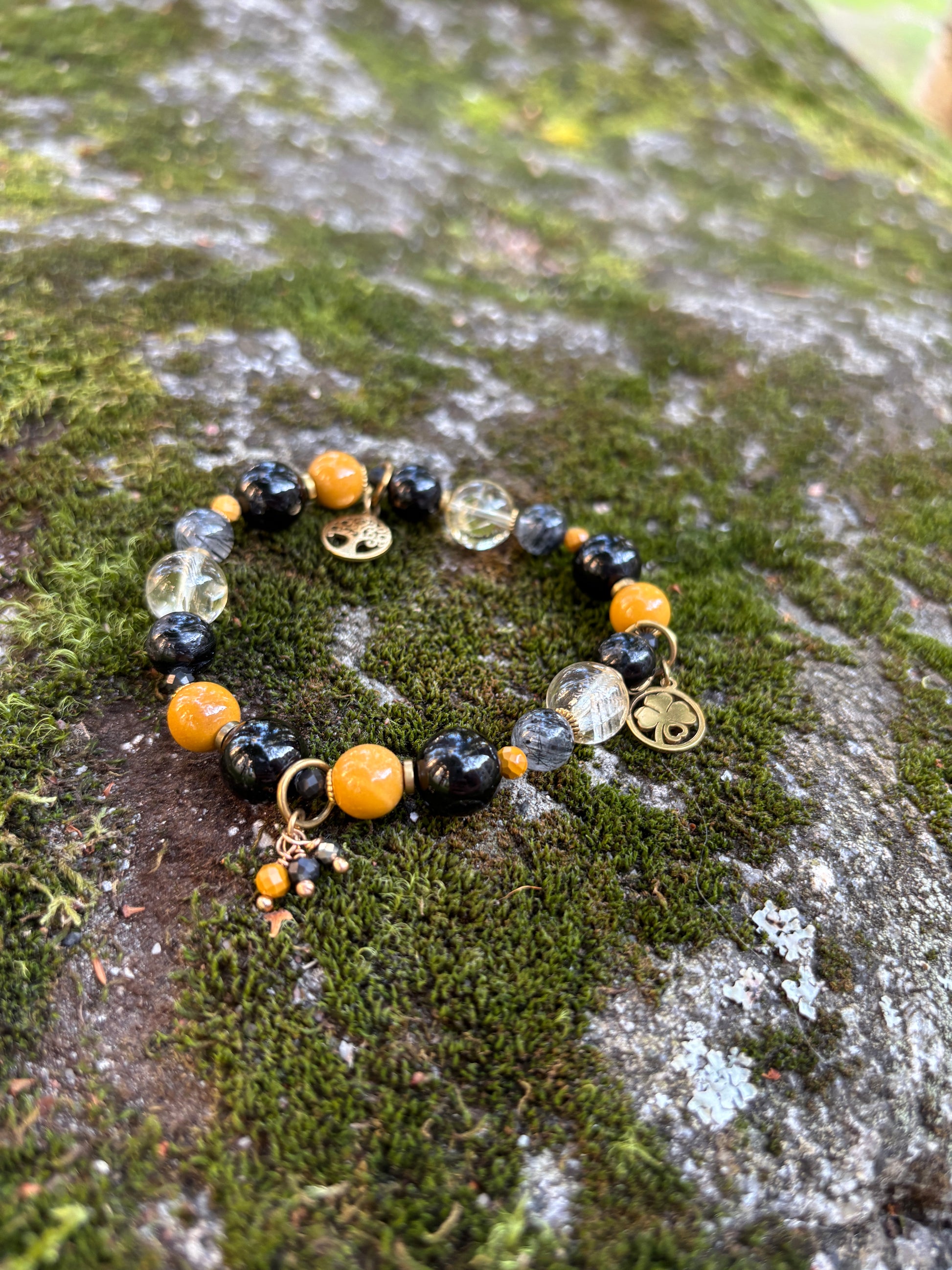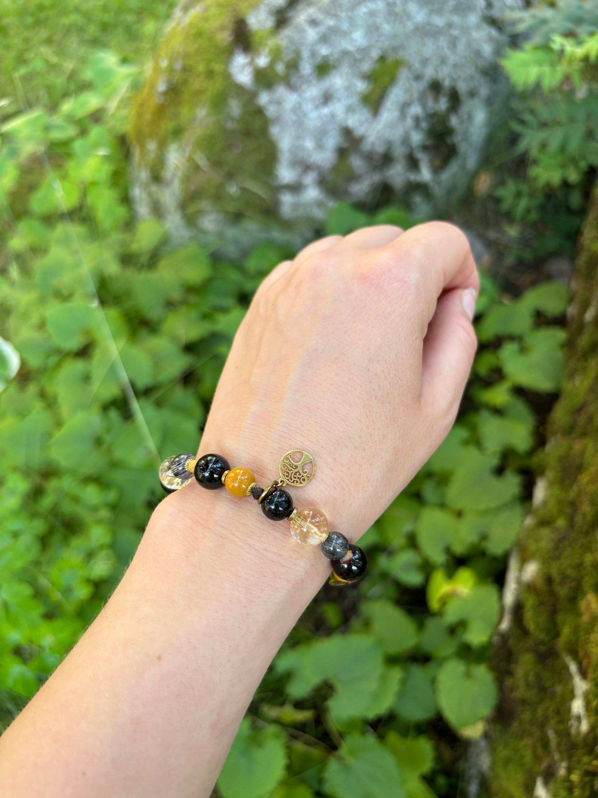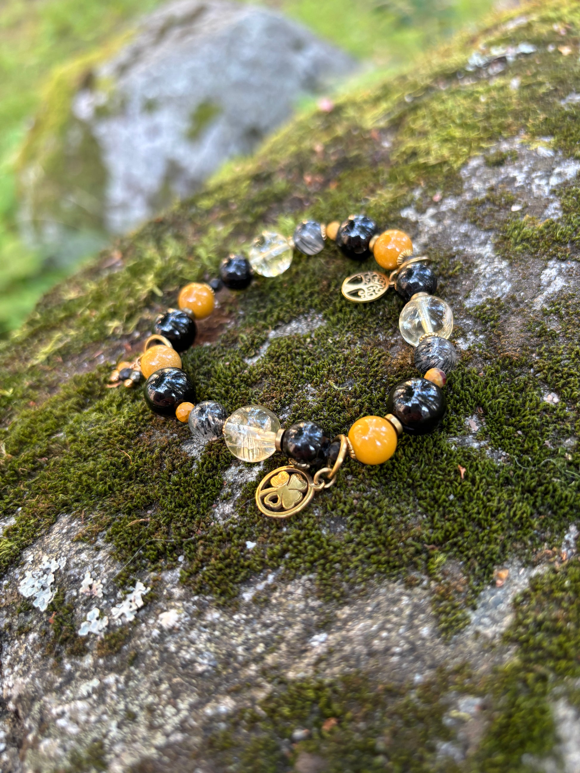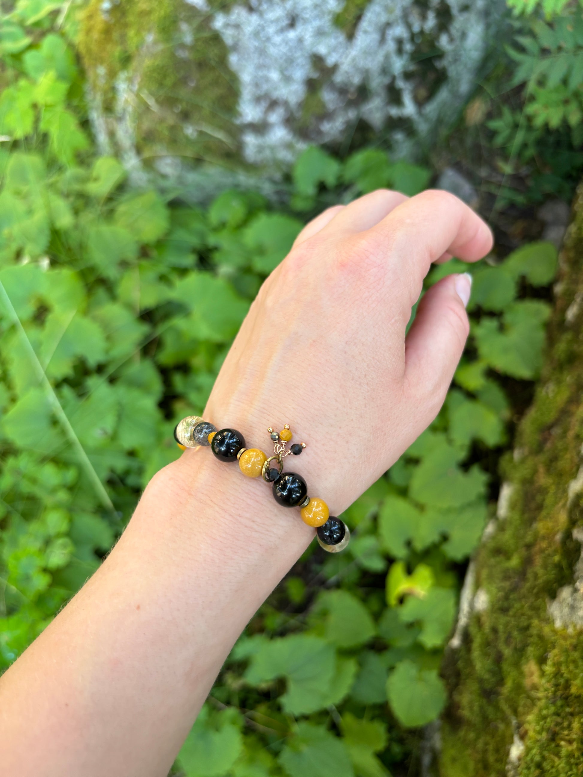 Suoja & Vetovoima — Musta-keltainen rannekoru turmaliinista, sitriinistä ja mukaiitista