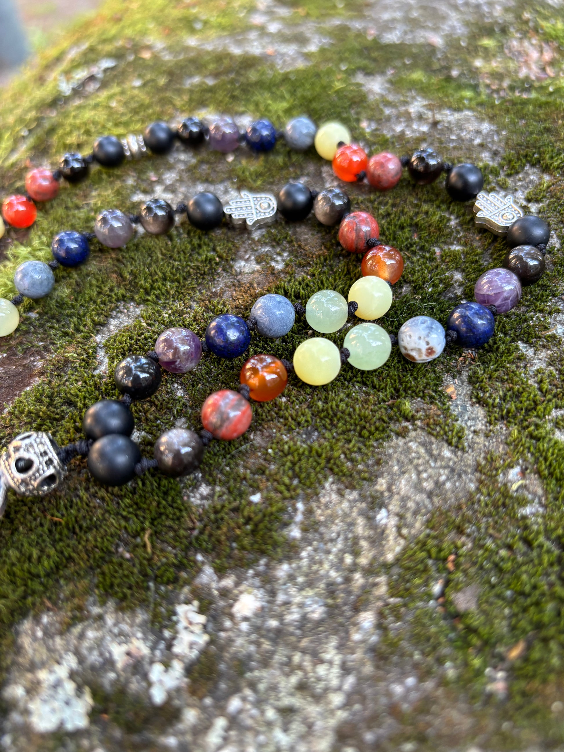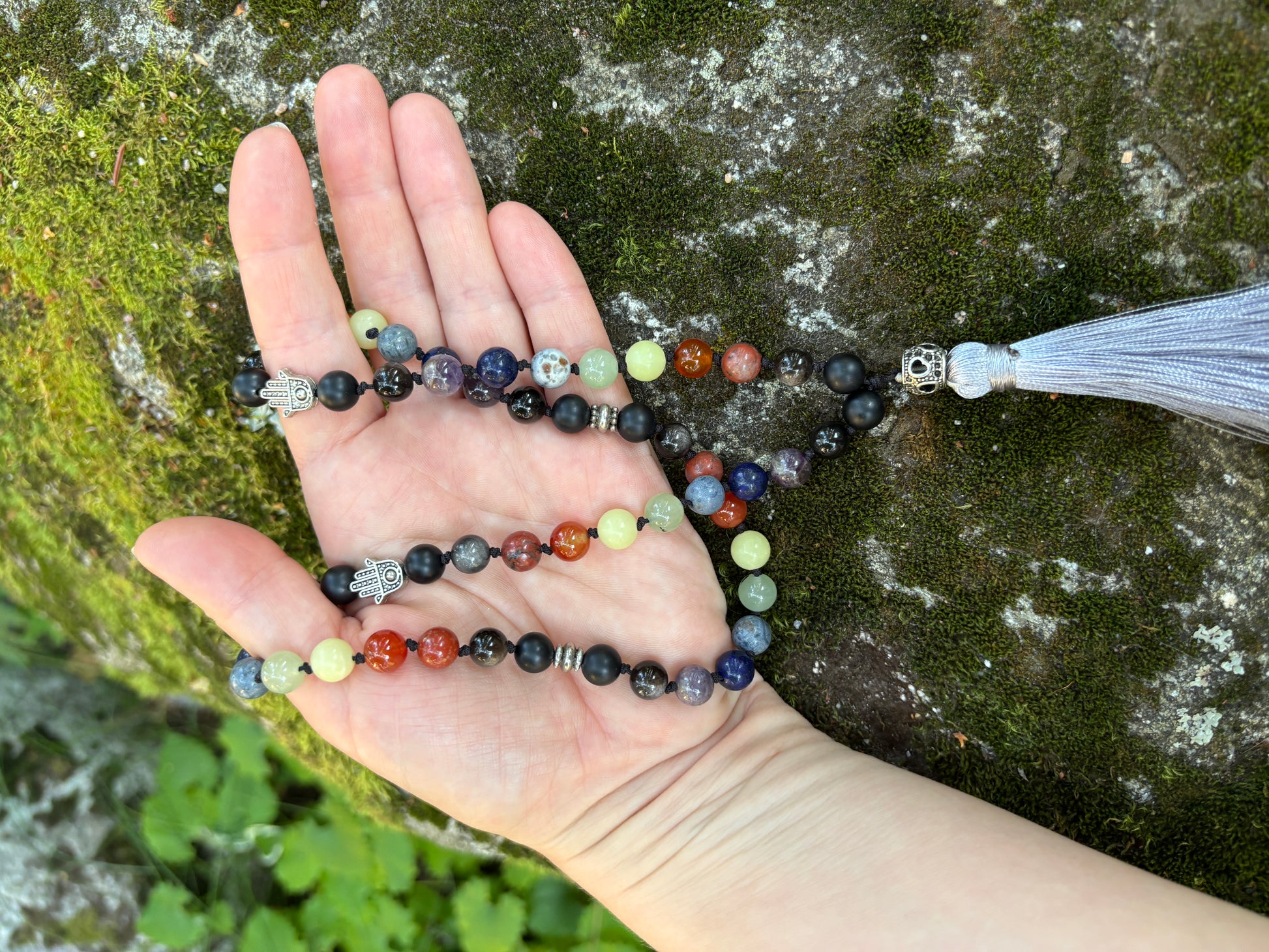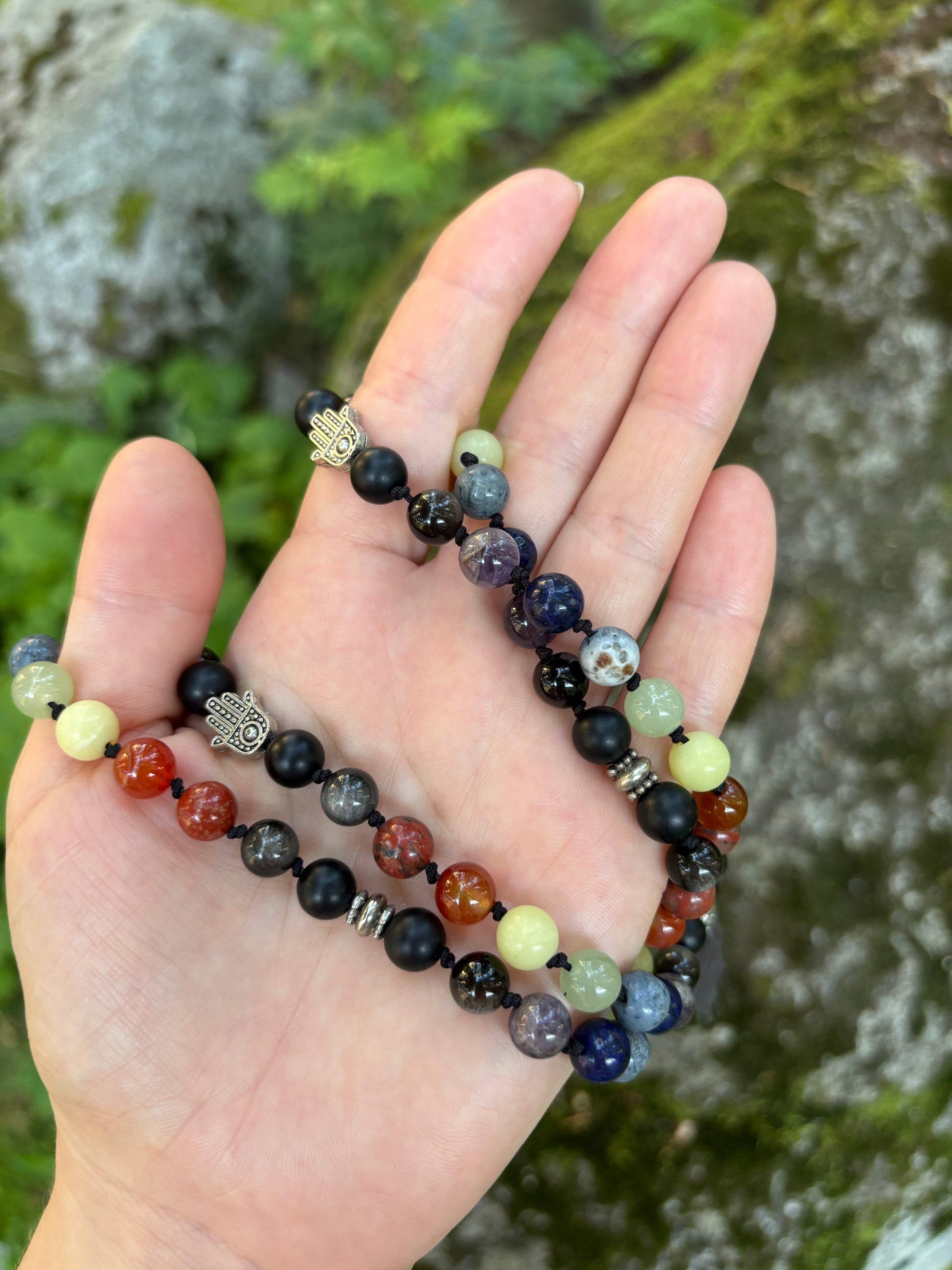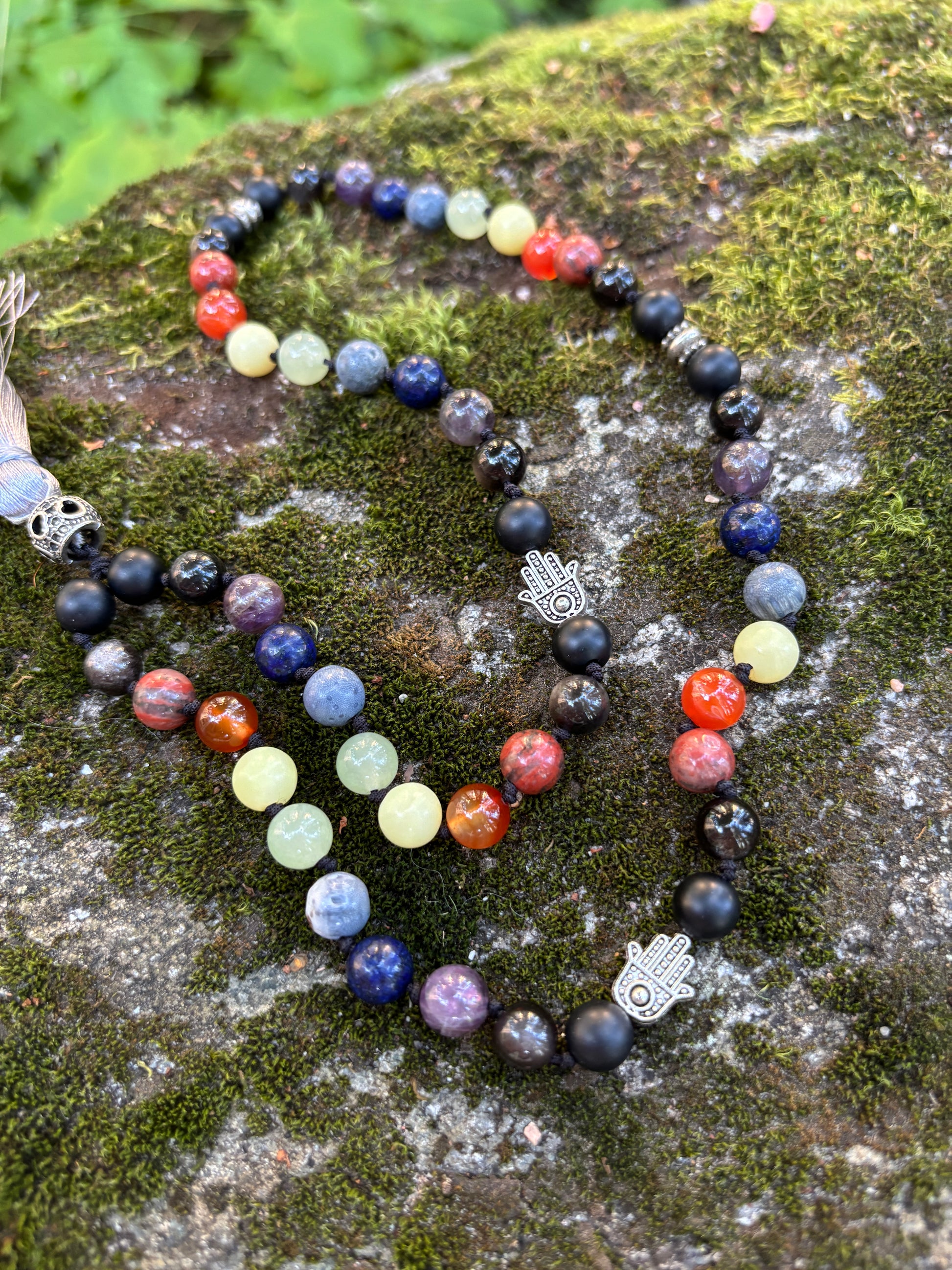 Keskellä malaa chakrablockit erottaa Jumalan käsi -helmi (Hamsa) — suojan ja tietoisuuden symboli.