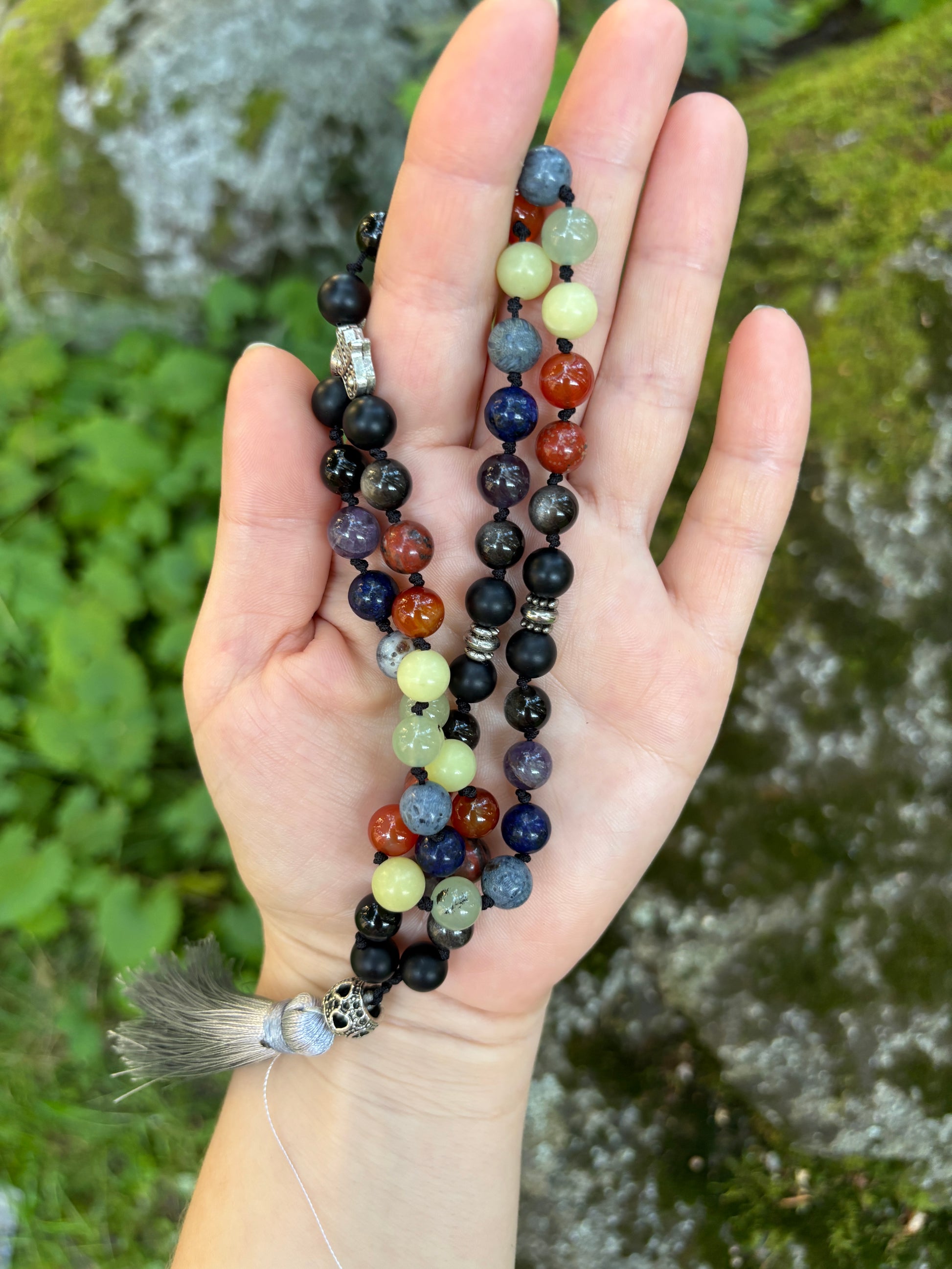 Nämä puolipitkät vedalaiset chakrakorut (mala) koostuvat 54:stä 8 mm:n kokoisesta kivestä, valituista huolellisesti chakrojen energioiden mukaan.